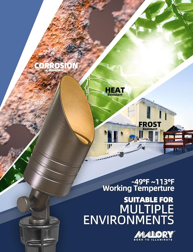- BRASS LIGHT FIXTURE:MALORY landscape spotlight is constructed of die-cast brass for durability and beauty.Brass spot light doesn't corrode,more durable and reliable than aluminum and plastic fixtures,ideal for any uplighting application.Simple design structure for the light fixture make it looks beautiful yet unobtrusive in any landscape,suitable for decorating most houses and yards.