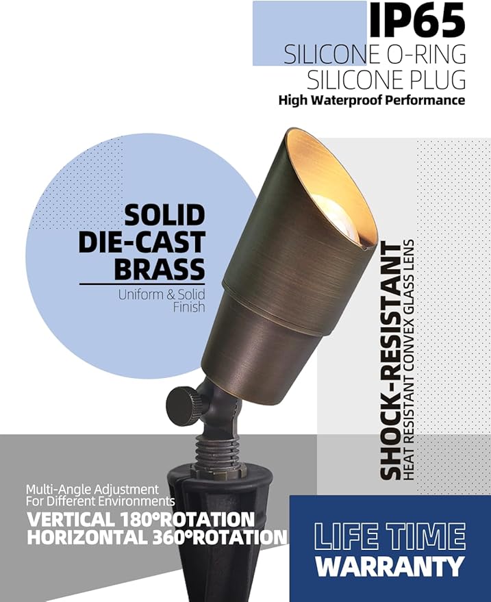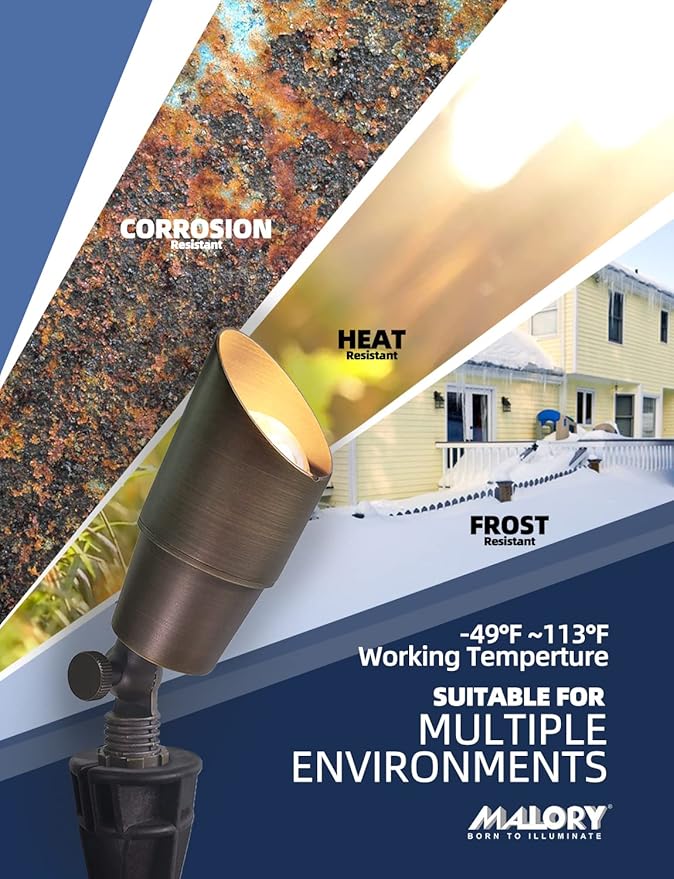 - BRASS LIGHT FIXTURE:MALORY landscape spotlight is constructed of die-cast brass for durability and beauty.Brass spot light doesn't corrode,more durable and reliable than aluminum and plastic fixtures,ideal for any uplighting application.Simple design structure for the light fixture make it looks beautiful yet unobtrusive in any landscape,suitable for decorating most houses and yards.