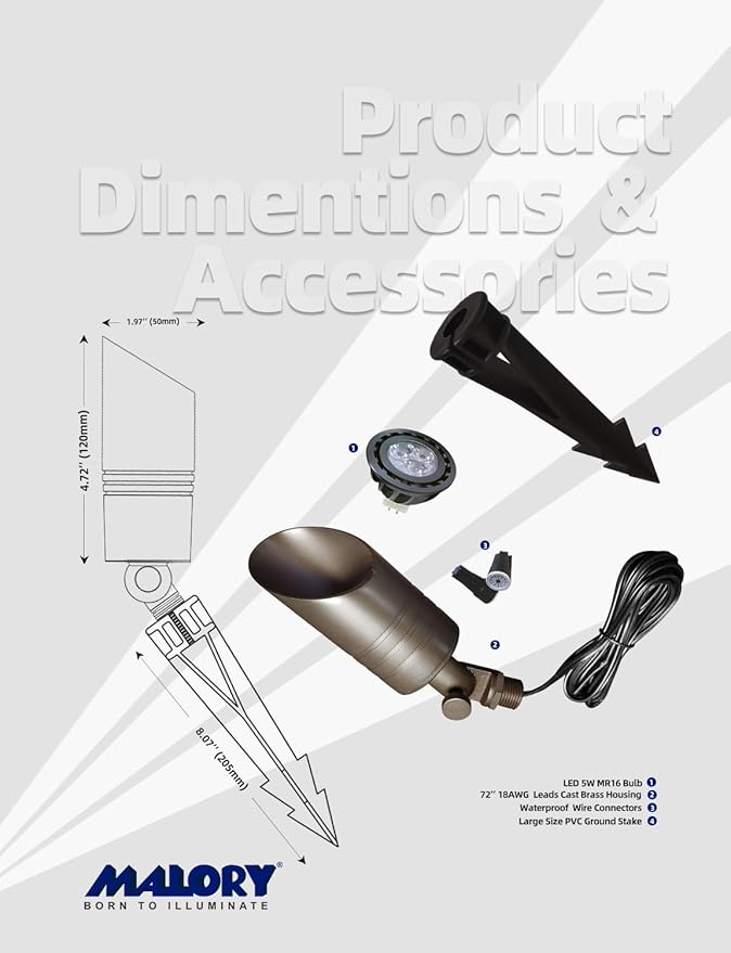 - BRASS LIGHT FIXTURE:MALORY landscape spotlight is constructed of die-cast brass for durability and beauty.Brass spot light doesn't corrode,more durable and reliable than aluminum and plastic fixtures,ideal for any uplighting application.Simple design structure for the light fixture make it looks beautiful yet unobtrusive in any landscape,suitable for decorating most houses and yards.