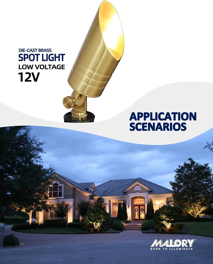 - BRASS LIGHT FIXTURE:MALORY landscape spotlight is constructed of die-cast brass for durability and beauty.Brass spot light doesn't corrode,more durable and reliable than aluminum and plastic fixtures,ideal for any uplighting application.Simple design structure for the light fixture make it looks beautiful yet unobtrusive in any landscape,suitable for decorating most houses and yards.