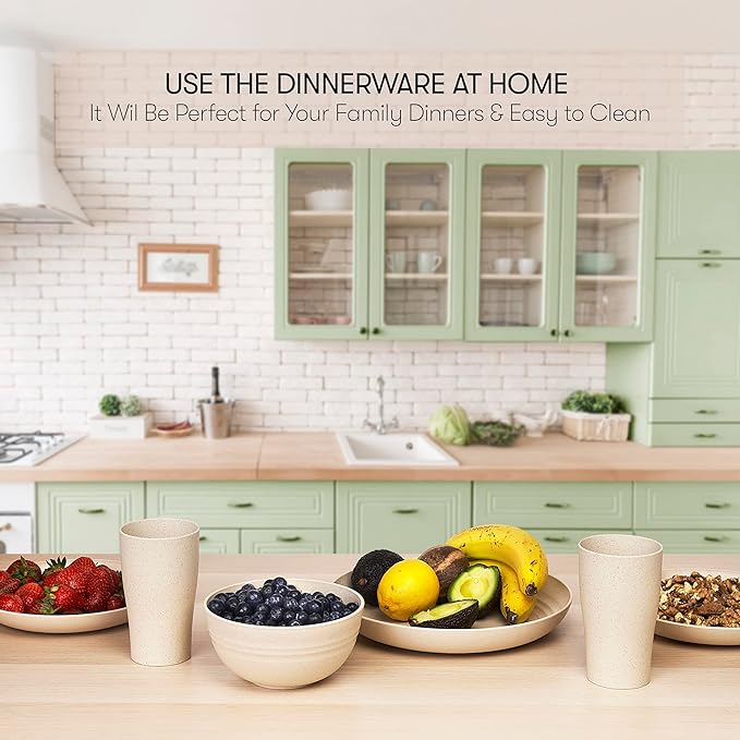 - Multipurpose Dinnerware - Our reusable dishes set for 8 are made for every occasion and will not only be great for home and kitchen use, but also convenient for an rv or camper, a picnic, BBQing, camping, work, school and much more. The unique design allows for easy compact storage as well. You can't go wrong with our wheatstraw dinnerware set.