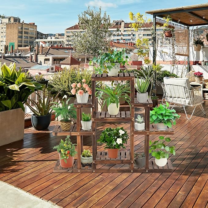 - [Stable Wood Structure] Made of full solid fir wood, our plant rack is good weather resistance and can be used for a long time. It has smooth edges to protect your hands from scratches. In addition, the plant stands have been carbonized to reduce the water content of the wooden plant stands by half, improving resistance to deformation. Moreover, the parts are tightly connected by screws to add stability and firmness.