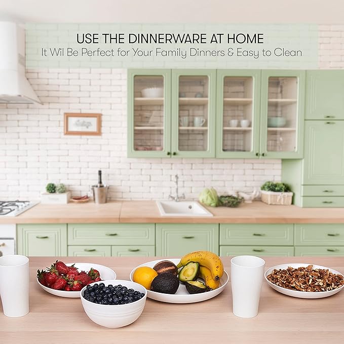 - Multipurpose Dinnerware - Our reusable dishes set for 8 are made for every occasion and will not only be great for home and kitchen use, but also convenient for an rv or camper, a picnic, BBQing, camping, work, school and much more. The unique design allows for easy compact storage as well. You can't go wrong with our wheatstraw dinnerware set