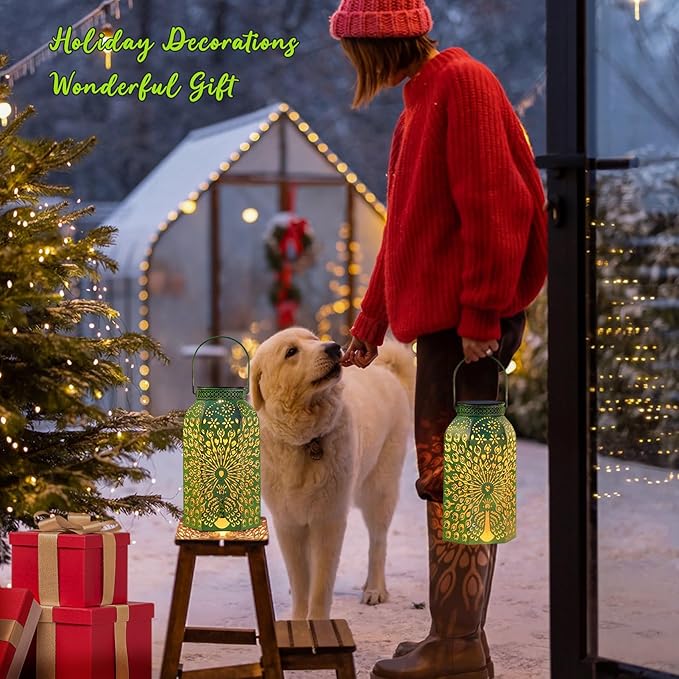 - {Unique Peacocking Design} The 2Pack big solar lanterns with peacock hollow design with attractive and antique natural green color, 800mAh Battery, emit 13 high lumens bright warm white glow and cast amazing pattern.Green peacock symbolize good luck, hopeand health, which is really nice gifts for your mom dad grandma grandpa sisters wife and friends.