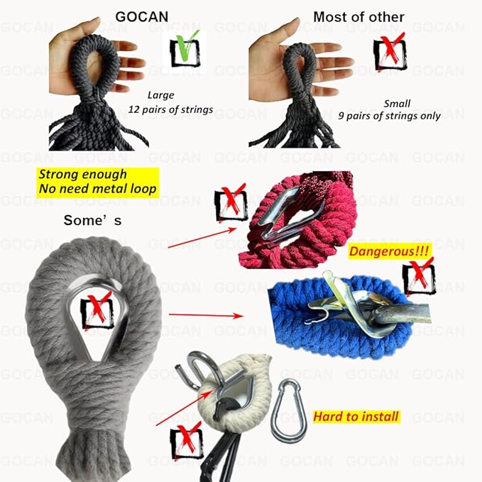 - 【3】Holds Up To 500 Lbs: The handcrafted knots at both ends and solid fabric are strong enough to holds up to 500 lbs. It is safe for couples, children and pets to relax or take a nap, the metal ring inside each end offers extra durability for long time using.