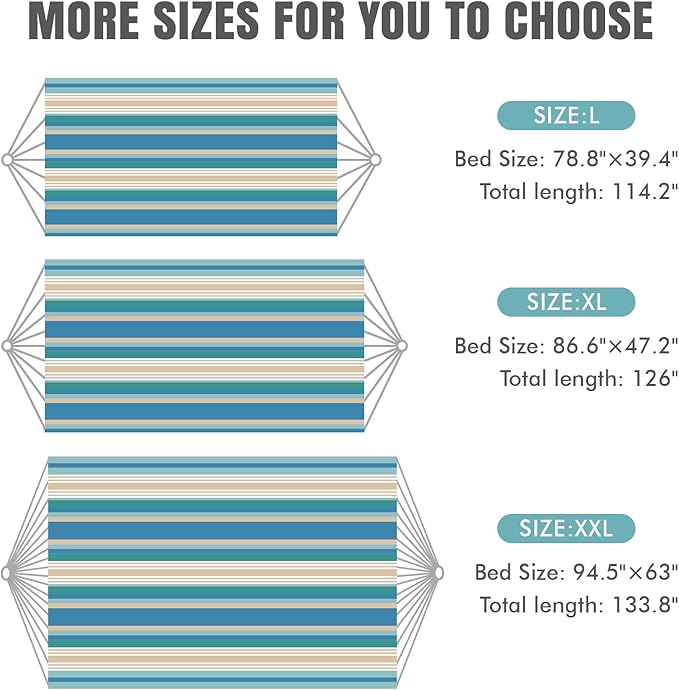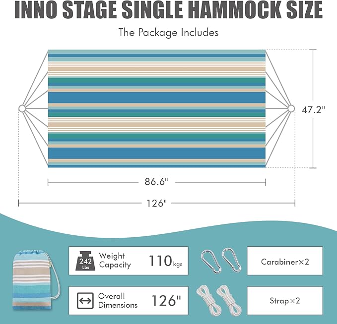 - Perfect 1-2 Person Hammocks for Outside: INNO STAGE hammock swing with a hammock bed surface length of 86.6" and width of 47.2", our hammocks is designed to accommodate a 1-2 person perfectly. The overall length of 126" provides ample space for relaxation while still maintaining a compact size. It can support a weight capacity of up to 242 pounds, ensuring stability and safety during use.