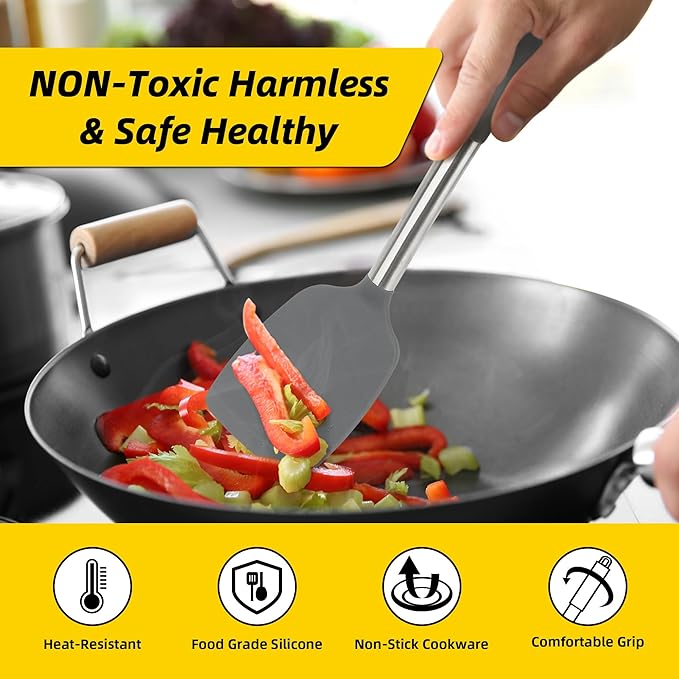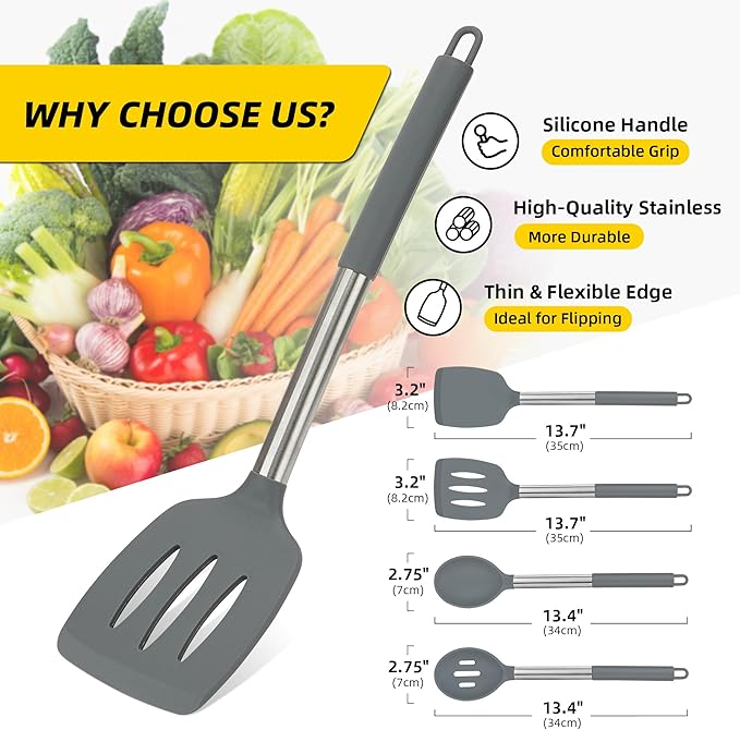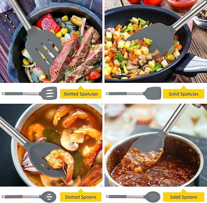 - 【Perfect Cooking Utensils Set】This silicone cookwares can satisfy all your need when cooking. The high-quality 18/8 stainless steel is more durable and keeps you away from the trouble of kitchen utensils rusting or breaking. The anti-scald silicone handle is not easy to conduct heat and is more comfortable to hold than traditional utensils. While you enjoy a happy cooking time, you can better protect your hands from being scalded.