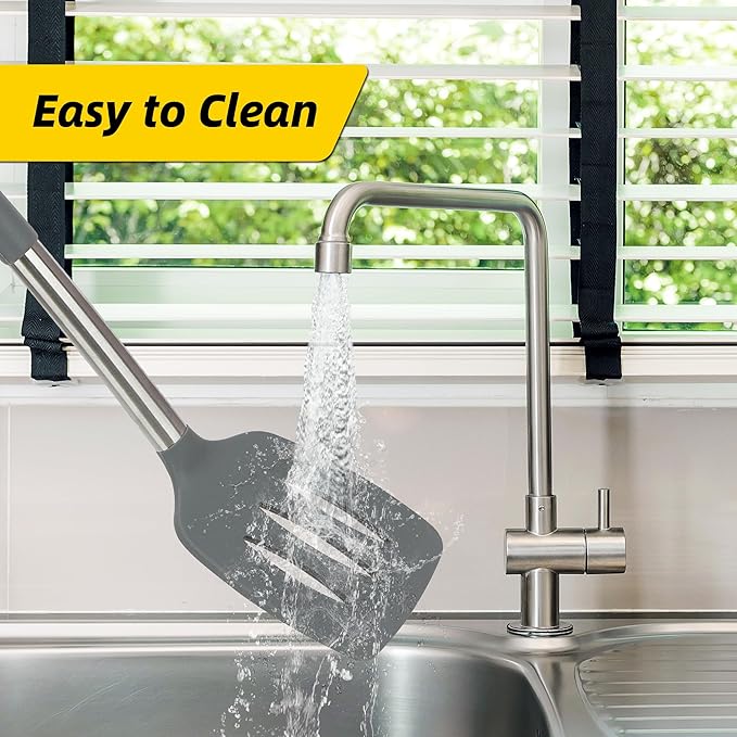 - 【Easy to Clean & Storage】Material silicone features Non-stick and non-absorbed oil or any liquids. Our versatile soup spoons and mixing spatulas set can be washed hassle-free with soap and warm water, and is also dishwasher safe. For easy storage, each big spoon and cakes spatula has a hole in the handle so you can hang them on kitchen wall hooks to dry fast.