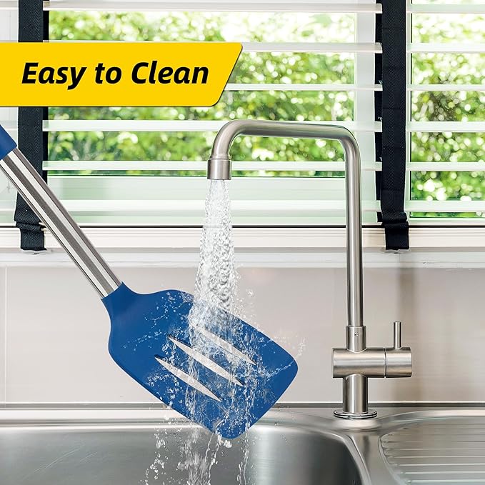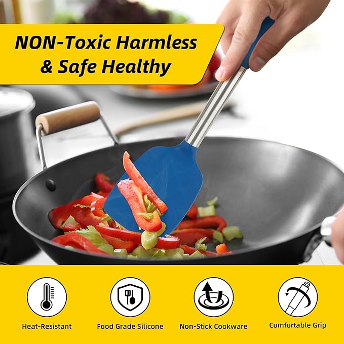 4 Pack Silicone Utensils Set, Non Stick Solid Spatulas, Heat Resistant Blue Slotted Spoons with Stainless Steel Handle, BPA Free Cooking Turner for Stir-Fry, Frying, Mixing, Serving,Draining,Turning
