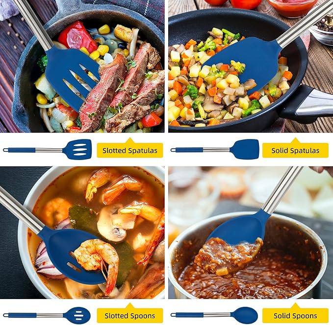 - 【Perfect Cooking Utensils Set】This silicone cookwares can satisfy all your need when cooking. The high-quality 18/8 stainless steel is more durable and keeps you away from the trouble of kitchen utensils rusting or breaking. The anti-scald silicone handle is not easy to conduct heat and is more comfortable to hold than traditional utensils. While you enjoy a happy cooking time, you can better protect your hands from being scalded.