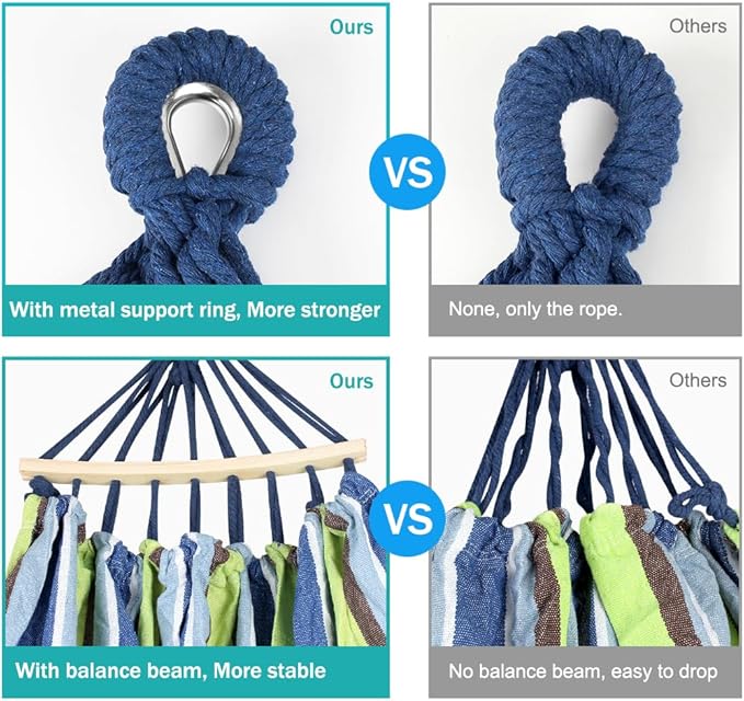 - 【Sturdy Metal Knot】The metal knot can prevent the long term friction between the knot and the tie rope. This prolongs the life of the tree hammock (extends the time limit by 50%). Additionally, the hammock comes with straps, ensuring a secure and stable attachment to trees.