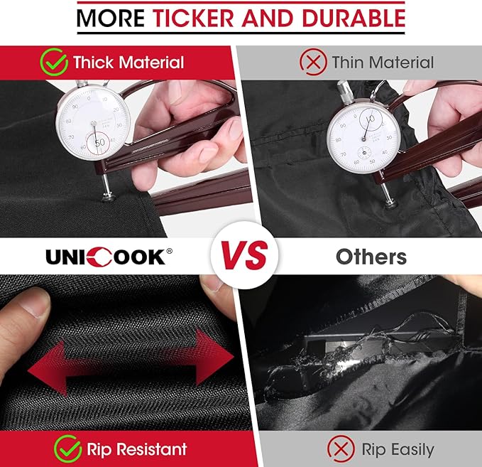 - Premium Material Construction: Unicook grill covers built to thicker, heavier and last longer. Constructed with premium Heavy Duty Fade Resistant polyester fabric with Waterproof vinyl coating, cost twice as the normal market materials do. Protect your grill from UV, rain, snow, dust and other harsh elements all year round