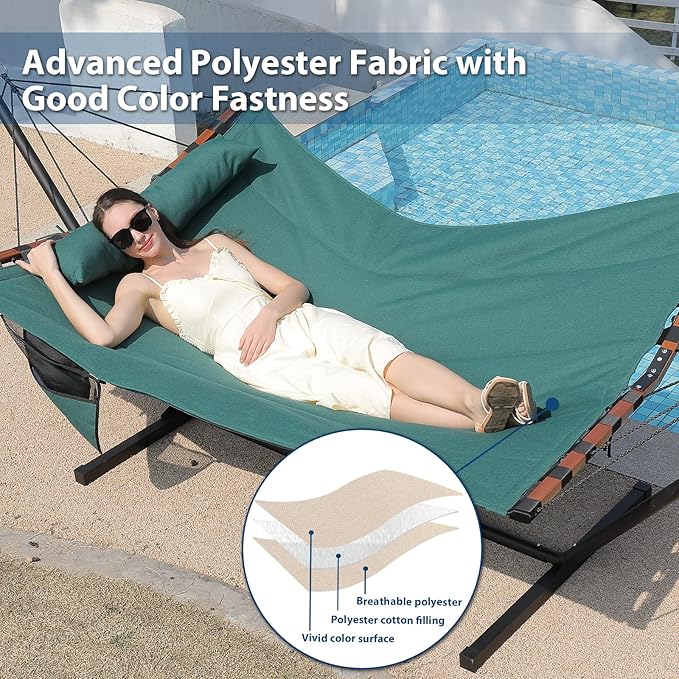 - ★Super Large Hammock: 55in width x 79in length large hammock bed can easily accommodate 2 people to enjoy the leisure time simultaneously (maximum 450lb capacity). The pillow is lengthened to 35.4in for two people. Besides, the hammock comes with a detachable side pocket for phone, books, cups and other stuffs for your convenience.