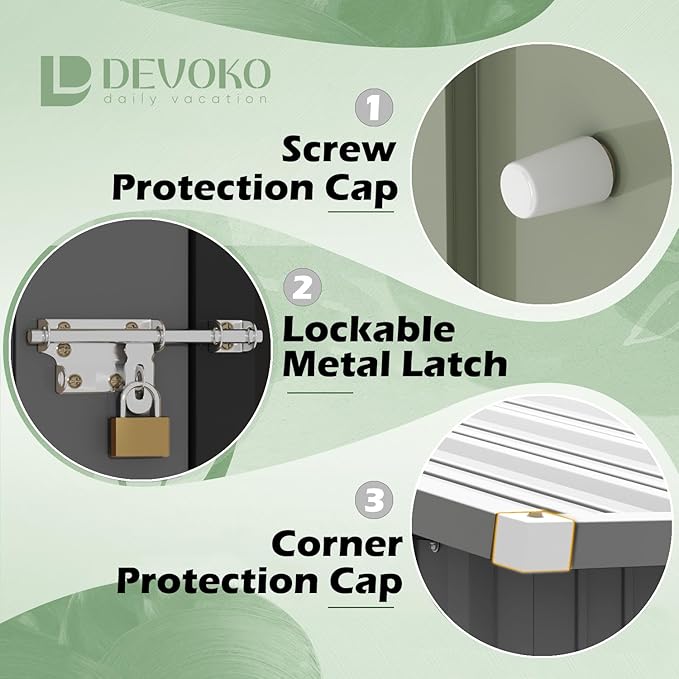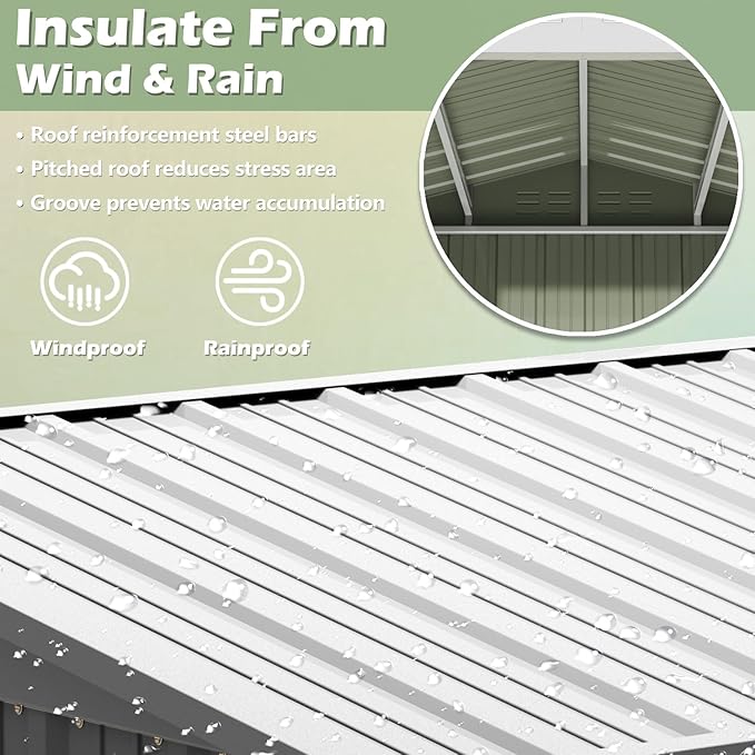 - [Security and Durability] 3 beams roofs stay strong in wind and snow. The metal garden storage shed adopts electro-galvanized steel process and paint treatment, which is suitable for various climates, without worrying about the metal rusting, the all-metal storage shed will not be deformed by the sun, and has excellent moisture-proof performance.