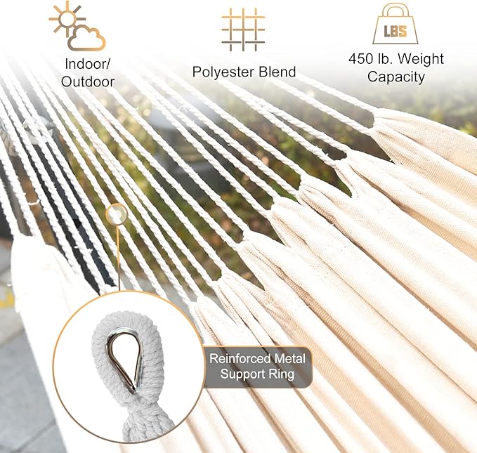 SZHLUX Double Hammock with Stand Included 450lb Capacity Steel Stand, Premium Carry Bag Included.Indoor Outdoor Brazilian-Style Cotton Bed for Backyard, Camping,Garden, Beige