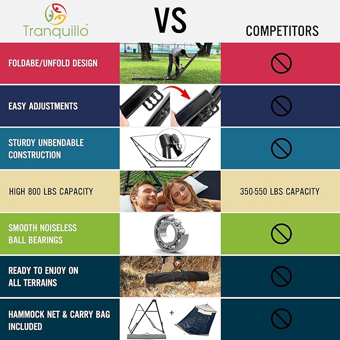 - PATENTED INNOVATIVE DESIGN: Proudly patented for its smart, tool-free setup in just 30 seconds, the Tranquillo Hammock with stand offers effortless outdoor relaxation. Easily adjustable for perfect comfort, built with durable materials for long-lasting use