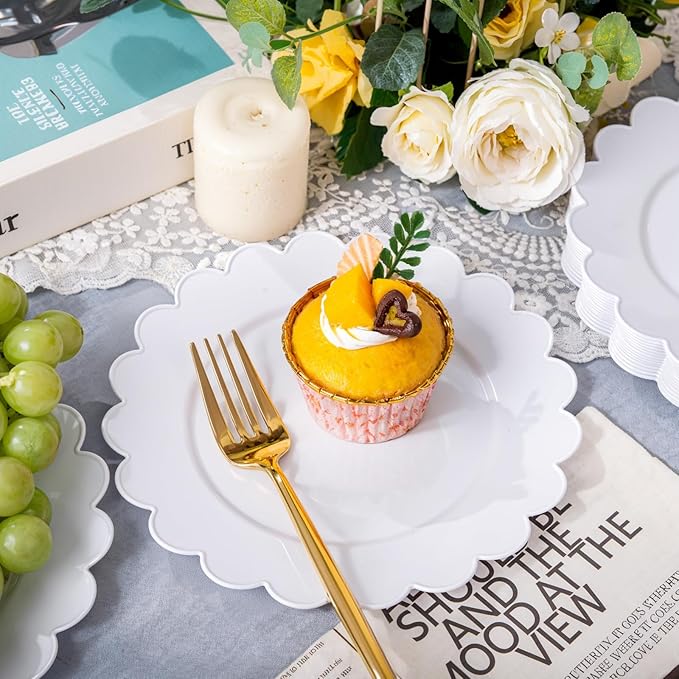 - UNIQUE DESIGN:Our white dessert plates, pure white simulated ceramic, Baroque plastic plates have a unique elegant design, fine details, the overall simple atmosphere. White round disposable plates can be paired with any food, stylish and beautiful.