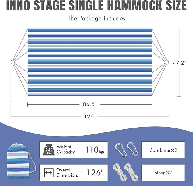 - Perfect Single Size Hammocks for Outside: INNO STAGE hammock swing with a hammock bed surface length of 86.6" and width of 47.2", our hammocks is designed to accommodate a single person perfectly. The overall length of 126" provides ample space for relaxation while still maintaining a compact size. It can support a weight capacity of up to 242 pounds, ensuring stability and safety during use.
