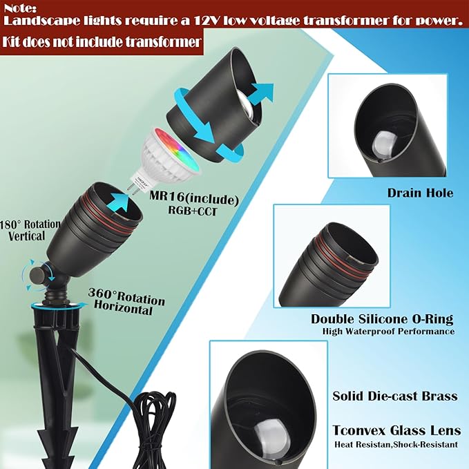 - Safety and Compatibility:iYogaled 12V brass landscape lighting is ETL Listed for safety. The 12V AC/DC low voltage is universally compatible with most outdoor transformers, delivering reliable and efficient operation. The inclusion of a Built-in MR16 RGB Bulb*4 with a high-quality driver inside guarantees a bulb lifespan of over 50000 hrs, saving you the cost and hassle of frequent replacements.Note that a 12V low voltage transformer(not included)is required for powering the spotlight.