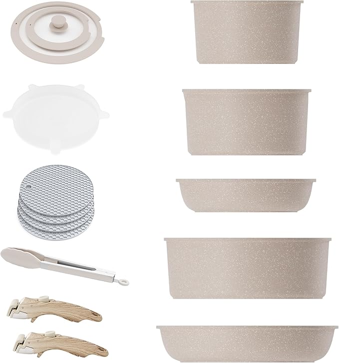 Caannasweis Detachable Nonstick Cookware Set - Stackable Induction Pots and Pans With Removable Handles, Dishwasher Safe - For RV Camping, Oven and Stovetop Use, 5 Pieces (Brown)