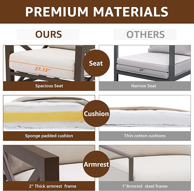 - 6.5" OLEFIN Cushion, Comfort: Patio outdoor sectional set has 6.5" thick cushions that are upholstered by water-repellent and UV-protective Olefin fabric for ergonomic optimal comfort. Filled with a high-resiliency sponge between two layers of thick cotton, outdoor patio furniture set cushions balance well with sturdy Frame.Thick Cushions will maintain shape easily after use. Cover of Olefin cushions can be removeable and washable by invisible zipper as well.
