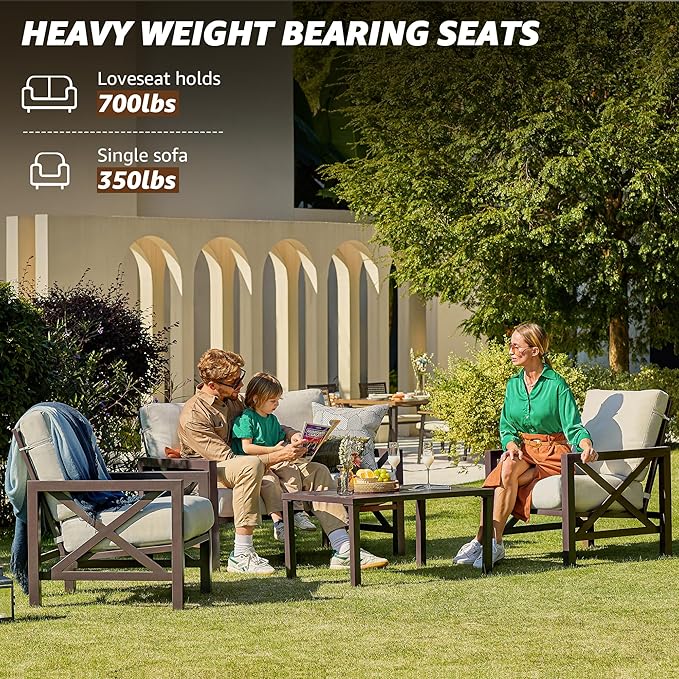 - SIMPLE DIY, Widely Used:Looking to experience outdoor leisure in style and comfort? This Metal 4 piece patio furniture set fits the bill; Ample seat space with thick cushions allows cozy family time, as well as great snuggling with your pet.With the metal furniture set in your garden,you can have an afternoon tea with your families or in a patio to have a conversation with your friends or a nice movie time to enjoy since it has various combinations to simly DIY.