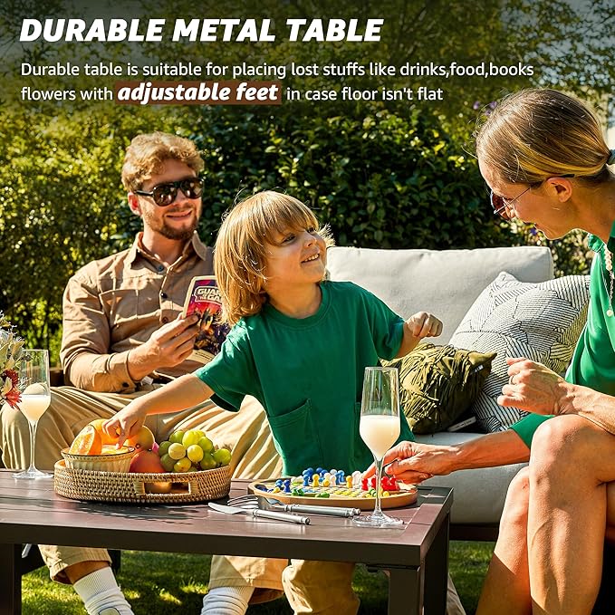 - Modern Elegant Design,Unique Decor: With X-shape handrail and backrest, 4 piece outdoor metal patio set not only provides ergonomic optimal comfort but also a Unique Decor in garden,yard and poolside. 2 Single Chairs and loveseat are made with thick,strong pipes to sit safe with 2"armrest .Metal Coffee Table has adjustable feet to adapt to floors and increase stability of furniture set. Outdoor couch furniture is modern, chic and just right size for any space.
