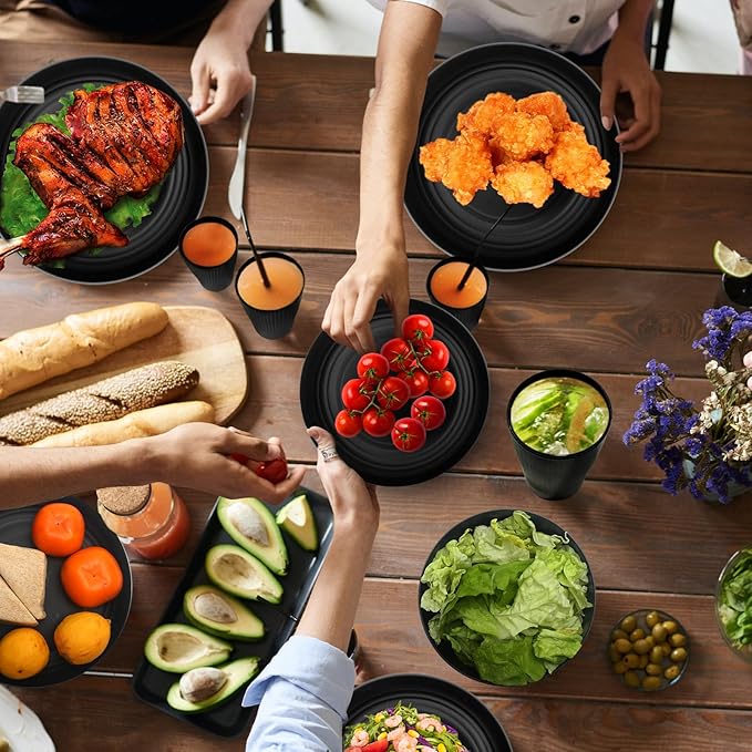 Wheat Straw Dishes Set for 8, Dinnerware Sets 32 piece, Unbreakable Plates, Bowls, Cups Sets for Kitchen Parties Camping RV - Black