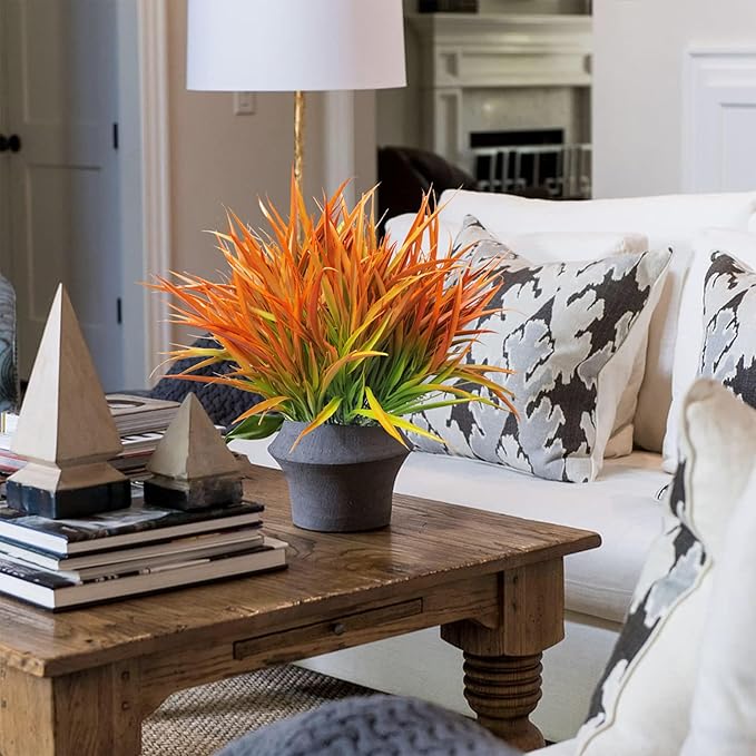 Outdoor Artificial Plants 8 Bundles Fake Plants Grass UV Resistant Fake Flowers Bush Greenery,17Inch Tall Faux Grass Shrubs for Home Porch Pathway Garden Décor Outside Indoor (Orange)