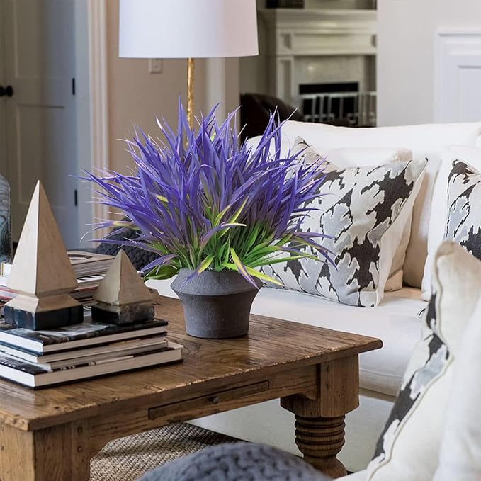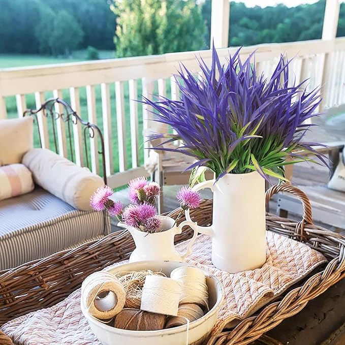 Outdoor Artificial Plants 8 Bundles Fake Plants Grass UV Resistant Fake Flowers Bush Greenery,17Inch Tall Faux Grass Shrubs for Home Porch Pathway Garden Décor Outside Indoor (Purple)