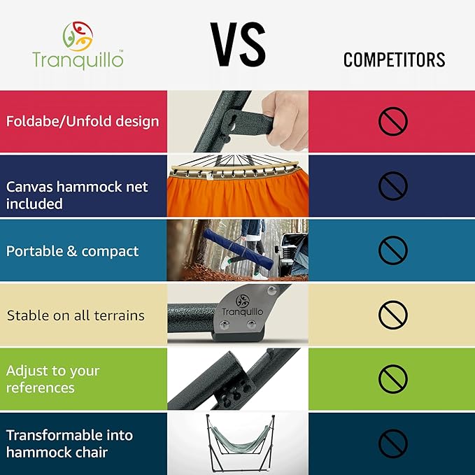 - PATENTED INNOVATIVE DESIGN: Proudly patented for its smart, tool- free setup in just 30 seconds, the Tranquillo Hammock with stand offers effortless outdoor relaxation. Easily adjustable for perfect comfort, built with durable materials for long-lasting use