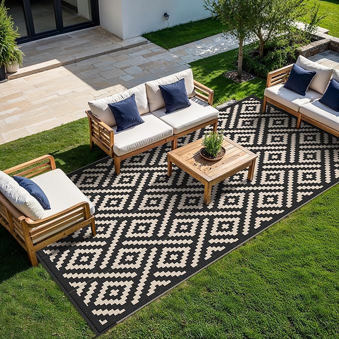 - Extended Lifespan · Dual-Sided Wear Resistance: The GENIMO outdoor rug features a reversible design with two classic geometric patterns, doubling its lifespan through alternating use. The dark-toned surface effectively conceals dirt, stains, and fall debris, maintaining a pristine appearance even in rugged environments. Perfect outdoor patio rugs, RV mats, and camping rugs for indoor-outdoor transition zones—effortlessly switch sides for practicality and timeless decor.