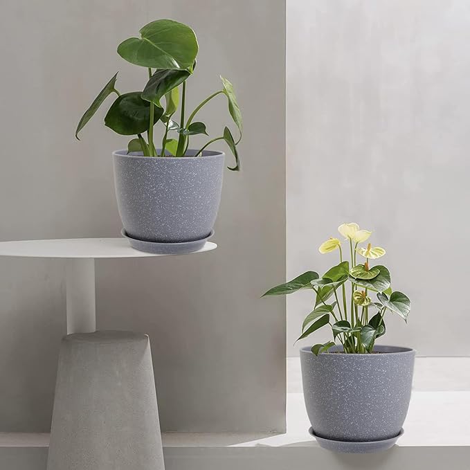 Modern Plant Pots Set, 9/8/7.5 inch Plastic Planters for Indoor Plants, Stylish Flower Pots with Drainage Holes and Saucers for House Plants and Flowers, Grey Speckles