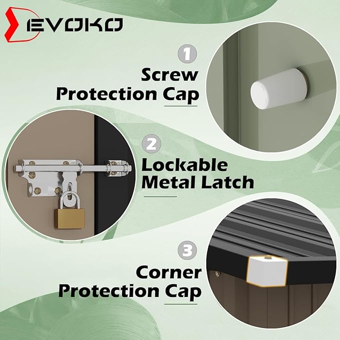 - [ Premium Durable Metal ]: Devoko storage shed is made of high-grade metal material, which has waterproof and UV-resistant properties. The thick material structure provides protection for the product's all-weather use, even in harsh weather conditions.