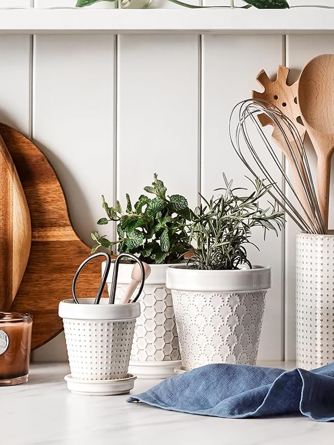 - Decor Living Space: Discover a cute embossed design ceramic pots –4 inches in diameter and 3 inches top opening, good for planting succulents and cacti. These ceramic flower pots add a touch of green to tables, windowsills, balconies, or bookshelves. Arctic white glaze, coupled with a light brown pattern, the delicate balance of embossed design and botanical vitality converges, creating an atmosphere of unparalleled grace and visual delight