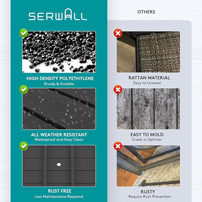 - 【Low Maintenance】HDPE dining table sets required low maintenance. Unlike the Steel dining sets may require rust prevention, SERWALL patio dining table and chairs are easy to clean with just soap and water, requiring minimal effort to keep them looking fresh.