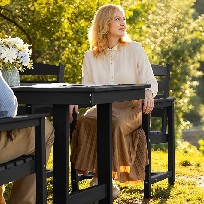 - 【Family-Friendly】HDPE patio dining table sets are family-friendly, providing a comfortable and safe space for outdoor meals and gatherings. The rounded edges are safer than sharp steel frames, ideal for families with children.