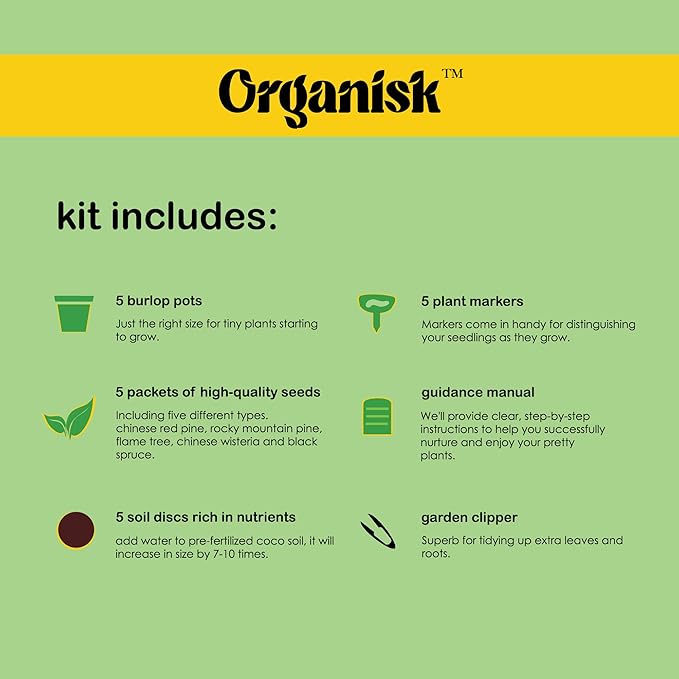 - Our kit includes 5 types of organic seeds (Rocky Mountain Pine, Flame Tree, Chinese Wisteria, Black Spruce, and Chinese Red Pine ) stored in seed-safe vials for successful germination. You'll also receive 5 biodegradable growing pots, 5 expanding-soil discs, 5 bamboo plant markers, 1 bonsai clipper, and a comprehensive instruction booklet.