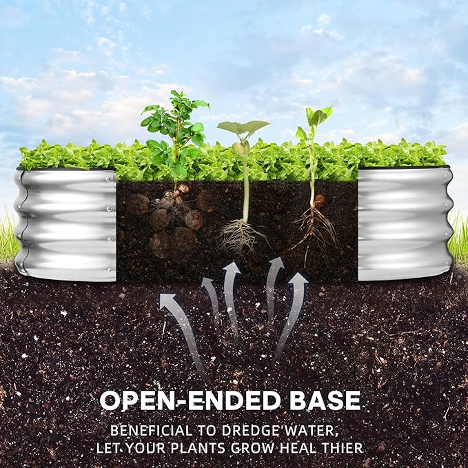 - Open base: This raised garden bed metal galvanized is designed with an open base, Sits on the ground garden bed which can effectively avoid water accumulation .