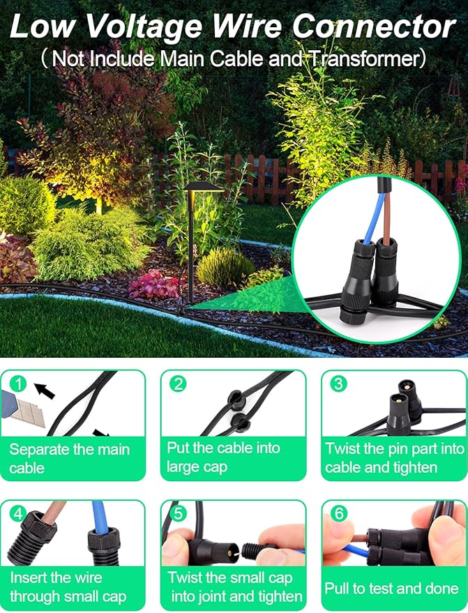 - 【Easy Installation & Wide Application】This Walkway Lights set comes with 16 pack low voltage wire connectors (Please Noted Not Include Main Cable and Transformer), easy to install and they can be widely used, such as: Garden, Pathway, Courtyard, Lawn, Sidewalk etc