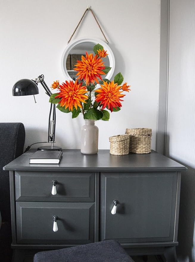 - 💐✨【Easy to care】Are you tired of dying flowers? Then our fake dahlia flowers will be perfect for you. Unlike fresh flowers used for flower arrangement which require everyday upkeep, the dahlias fake flower can be placed and reusable in many settings for a long period without any care. Green stems and leaves, bright flowers, let your room and life exude a strong breath of love and life. Bringing beauty and good mood to your day, they are a great addition to your spring displays!
