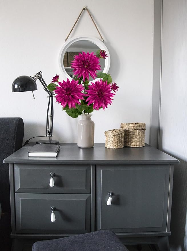 - 💐✨【Package】Total 3 pieces come in a pack(Vase not included); each piece has two head(1flower and 1bud). Artificial dahlia flower total height -- 29.5 inches. Each one flower head approx 7.5 inches in diameter. Long stem will look beautiful in a big floor vase or tall jar, and it is made of metal and plastic, if the stem is too long for your vase, You can bend or cut them to adjust the size as needed.