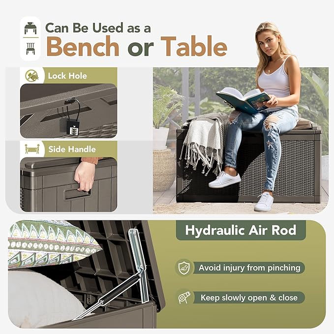 - [Wide Applications]Simple appearance with multi-purpose design, this storage box can easily integrate into your various indoor and outdoor scenarios like living room, balcony, porch, patio, deck or poolside. Store your tools or cushions