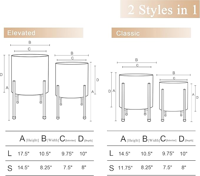 - 【Size】The package contains two flower pots. Large planter pot: 10.5" Diameterx17.5" H ; Small planter pot: 8.25" Diameterx14.5" H. the planter is perfectly suited to fit a wide variety of interior and exterior plants ranging such as small trees, flowers ,cactus and all other garden plants.