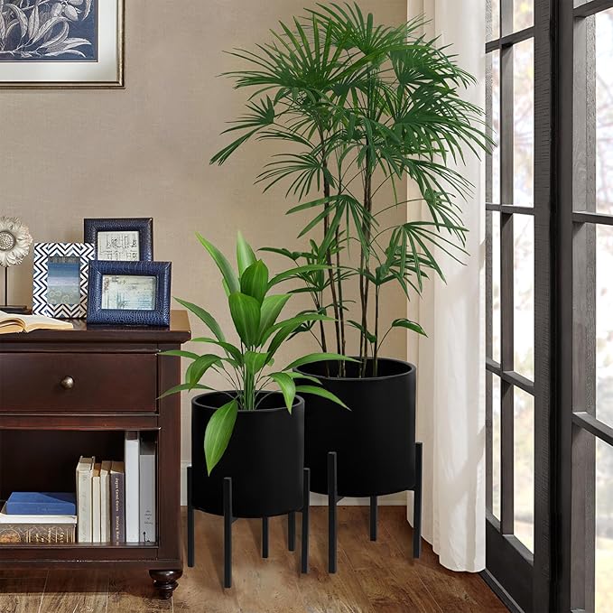 ARNIS Modern Plant Pots, Set of 2 Large Planters with Stand, Decorative Planters, Metal Pots with Drainage Holes for Living Room, Office, Garden or Balcony, 8.25 &10.5 Inch, Blcak