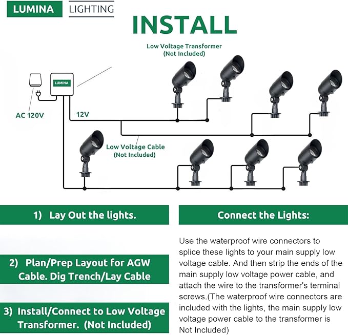 - 【Easy Installation】Just insert the (Light Ground Spike Stand) into the suitable position on ground, Then use Wire Connectors to Connect Landscape Lighting Fixtures. Light Fixture pre-wired with UL listed direct burial Wire/Cable. (Ready-To-Go SpotLights)