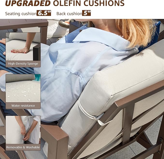 - Wide Deep Seating,6.5" Cushion:Patio outdoor set with wide Deep seats provide ample room to relax and unwind with ease. Olefin covers are water-resistant, UV-protective for long time use,removeable, washable by zipper too. Filled with a high-resiliency sponge between 2 layers of thick cotton, outdoor patio set cushions balance well with sturdy Frame for optimal comfort. 6.5" Thick Cushions will maintain shape easily after use which you don't wanna stand up once sitting.