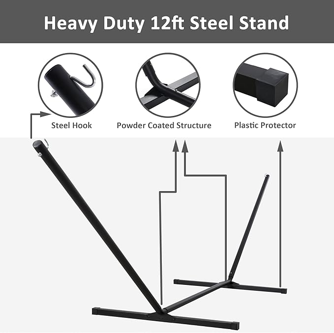 - Freestanding Hammock with Portable Stand: No damage to trees. Created to be stable and long-lasting, the 12 ft stand is made from powder-coated heavy gauge steel. It can be easily assembled in minutes without any tools, and it could be disassembled easily. Feel free to contact us if you have any questions during use within one year of purchase. We are always here to help