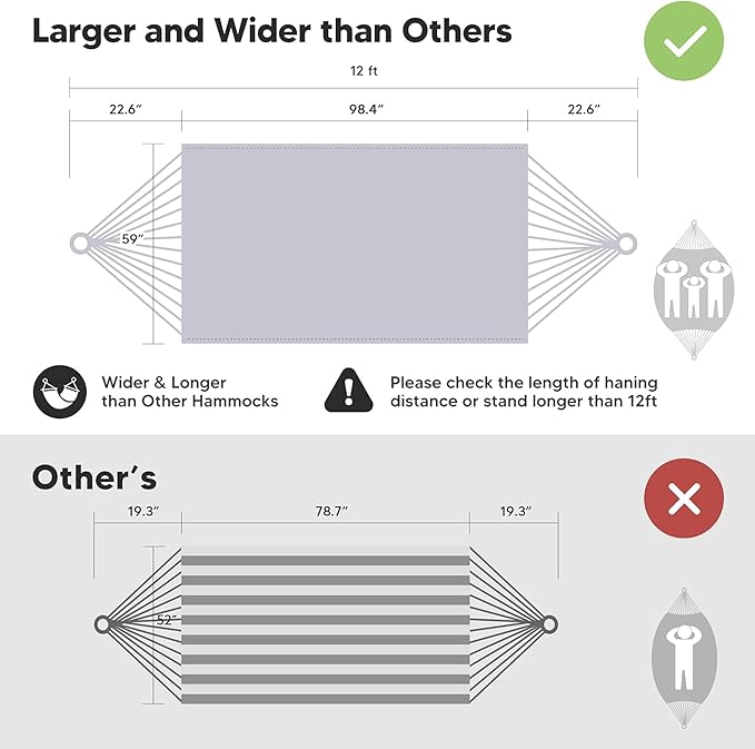 - Larger Bearing Capacity: The heavy duty hammock's total length (from loop to loop) is 144 Inches while the bed size is 98”long X 59”wide, making it perfect for couples