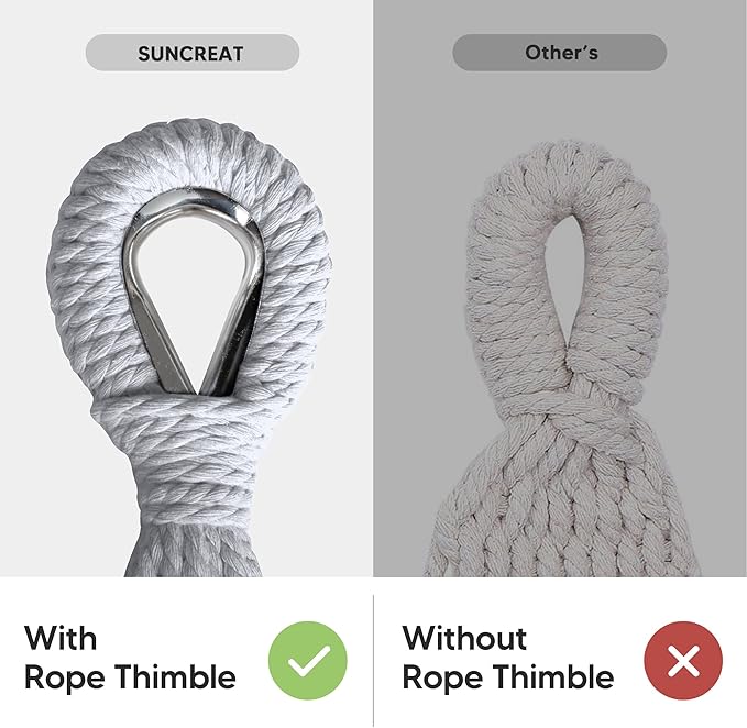 - Handcrafted Ropes: The metal rope thimble is effective for preventing the long-term friction between the tree strap and the ropes, thus prolong the service life of the hammock. The 18 ropes at both ends of the hammock are made of poly-cotton, tightly braided and fixed, which greatly increase the load bearing capacity